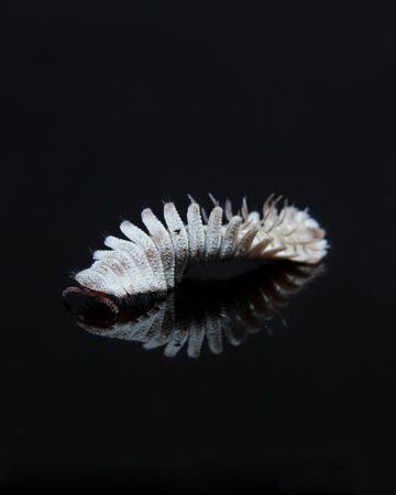 A detailed macro shot of a translucent orange segmented insect larva, showcasing its numerous legs and antennae, reflected on a dark surface.