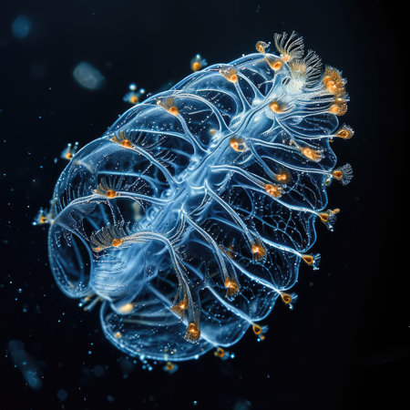 A Group of Jellyfish Swimming in an Aquarium, A close-up perspective of microscopic life forms like plankton, during a feeding frenzy, AI Generated