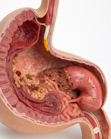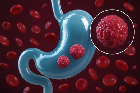 a medical illustration depicting the human digestive system with a tumor highlighted in the stomach area, highlighting the need for diagnosis.