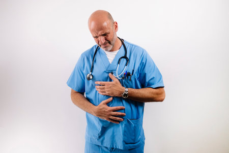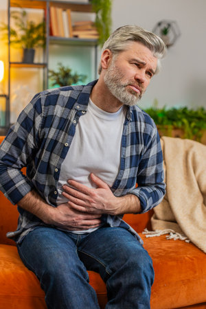 Senior man suffering from stomach pain, holding his abdomen discomfort in due to indigestion, representing health issues, illness, and a problem with his well being