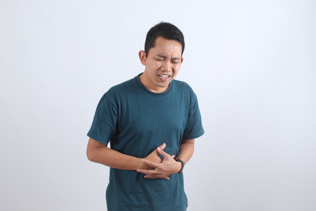 Sick Asian man holds his belly in discomfort from painful cramps. Concept for indigestion, gastritis, or a digestive health problem.