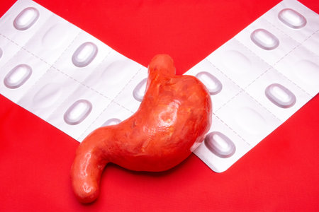 Medical Setup with Stethoscope, Human Stomach Model, and Pills on Wooden Surface