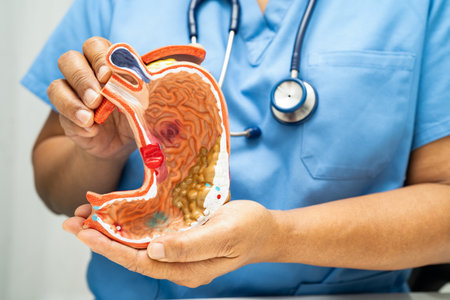 Stomach disease, doctor holding anatomy model for study diagnosis and treatment in hospital.