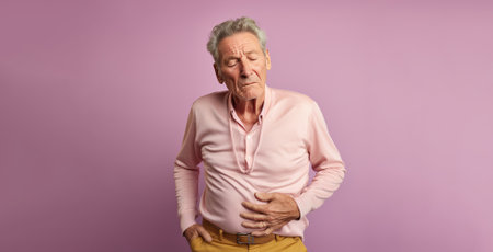 Old man holding stomach with discomfort from gastritis on pink background