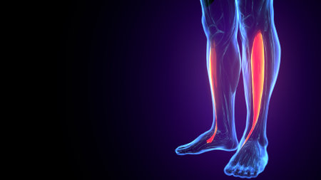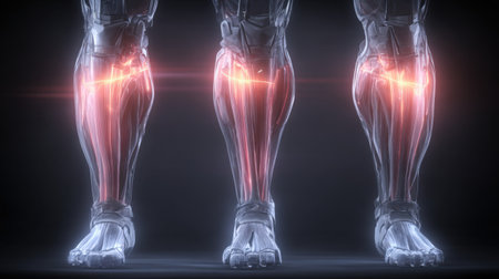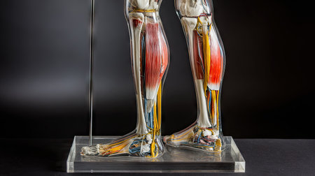 This scene showcases a close-up of human lower leg anatomy, emphasizing muscles and structure under dramatic lighting for educational insights.