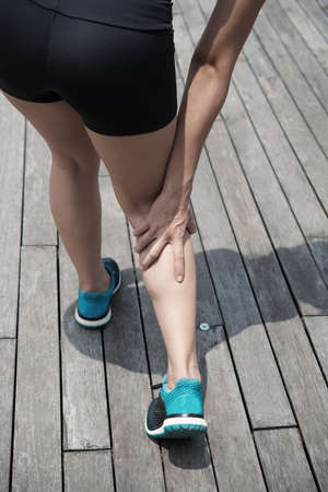 Close-up of unrecognizable woman in shorts and blue sports shoe touching painful leg while walking on wooden pier