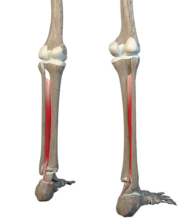 This 3d illustration shows the tibialis posterior muscles on skeleton on a white background