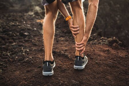 Runner Knee pain in the woods on trail with muscle strain and emergency.