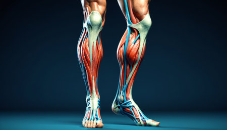Anatomical illustration showcasing the muscles and tendons of the human lower leg, highlighting their roles in movement and mobility. Perfect for educational and healthcare use.