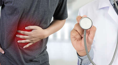 Hand touch in the stomach has abdominal pain or chronic gastritis. Man suffer from belly ache. Stomach Pain and Colon cancer Concepts