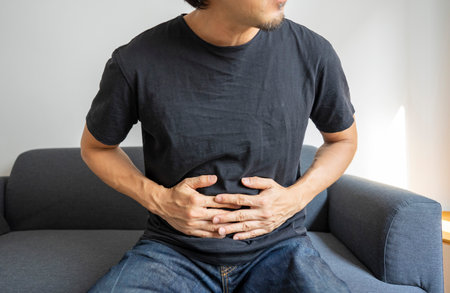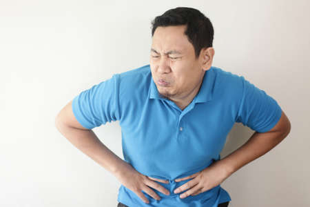 Man suffering from stomach ache or indigestion. Healthcare concept.