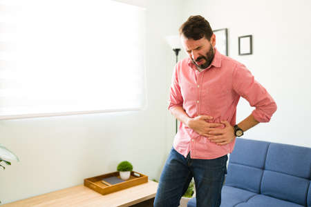 Suffering man in a lot of pain due to gallstones after standing from the couch. Young man with a gallbladder disease touching a side of his stomach