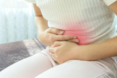 Woman touching stomach painful suffering from stomachache causes of menstruation period, gastric ulcer, appendicitis or gastrointestinal system desease. Healthcare and health insurance concept