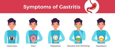 Main gastritis symptoms flat horizontal infographic banner with stomach heaviness pain flatulence nausea vomiting heartburn vector illustration