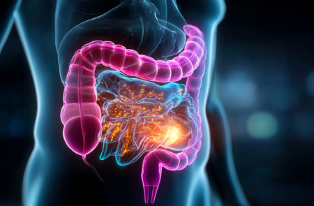 A detailed anatomical illustration featuring a semi-transparent human figure, emphasizing the complex network of intestines amid a sleek, dark backdrop.