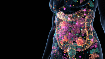 This displays the digestive system with a focus on gut health, highlighting soft transparent anatomy and colorful microbial activity.