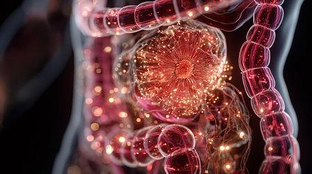 This medical illustration showcases a detailed view of the human intestines. It highlights the digestive system with vibrant colors and intricate textures. The composition employs a clear and informative style, possibly for educational or scientific purposes. This image may be suitable for use in medical publications or educational resources.