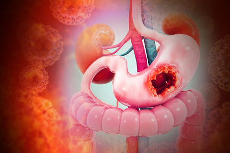 Cancer cells attacking the stomach, gastric cancer, symptoms, stages, treatment, 3d illustration