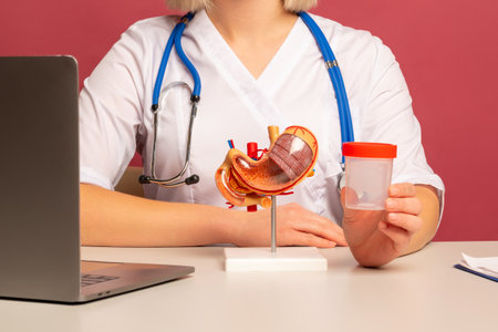 woman doctor hand hold test tube sits in her office with anatomical model stomach on desk