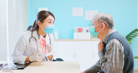 asian female doctor wearing face mask is showing stomach model and explaining to elder senior man patient in hospital