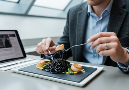 A man in professional attire enjoys a luxurious meal of squid ink spaghetti and seared scallops served on a modern slate plate during a business lunch.