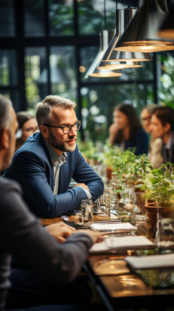A mature businessman in a blue suit is leading a team discussion in a modern office with colleagues around a table with plants.