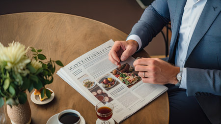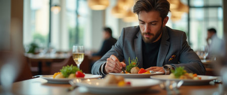 Elegant businessman savoring a gourmet dish while enjoying a glass of white wine in an upscale restaurant with a luxurious ambiance