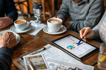 Meeting with a financial advisor in a cozy cafe, discussing their retirement plans over coffee. The table is filled with documents, charts, and a tablet showing their financial progress.