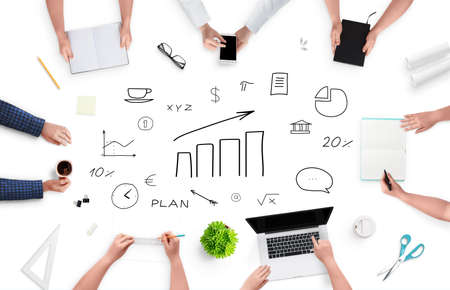 Company meeting with business plan growth sketch concept. Team work on project. Top view, flat lay