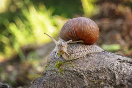 A snail on a rock covered with moss. A snail on a green blurred natural background on a sunny day.