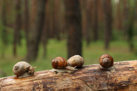 Yellow snails walking around the garden. Snail on the tree in the garden. Snail gliding on the wet wooden texture. snail Catch the stump,snail,beautif ul snail,snail on the wood,single snail