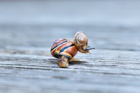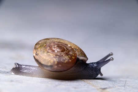 Small garden snail in shell crawling on wet road, slug hurry home. Snail slug consists of edible tasty food coiled shell to protect body. Natural animal snail in shell slug crawling in big wild nature.