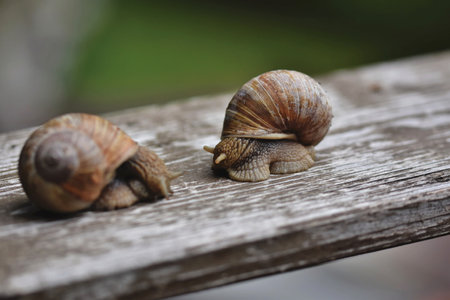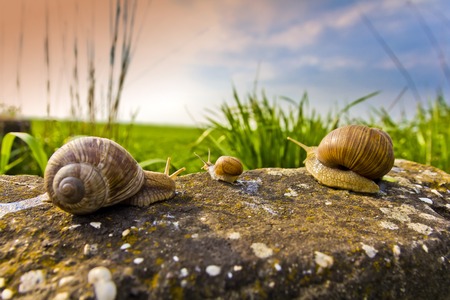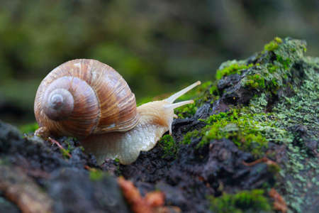 Snail crawling on the stone in the garden. Shallow depth of field.