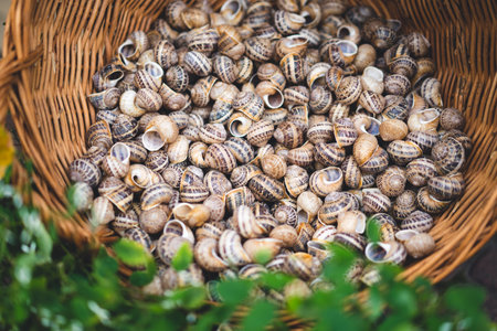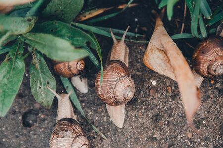 Burgundy snail Helix pomatia or escargot is a species of land snail. Burgundy snail gliding on the ground. Edible escargot. Growing snails. close up