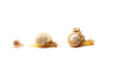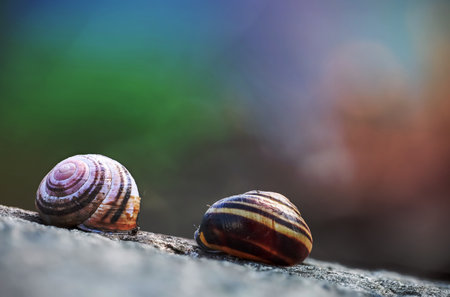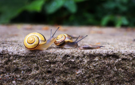 Snails crawling on a textured dark gravel surface, showcasing their distinctive striped shells and slow movement, highlighting nature s intricate details and wildlife