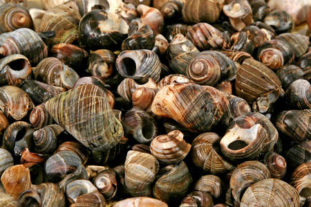 Spiral snail shells. Gastropod shells. Macro, closeup.
