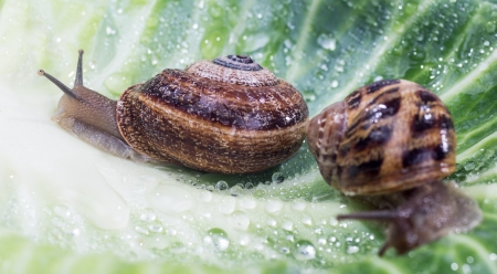 Large snails Helix Aspersa Maxima under running water on a snail farm. Breeding edible snails. Business.