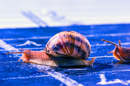 The image shows two snails crawling on a rough, grey surface. The snails are facing the same direction, with one slightly ahead of the other. The snails are brown and tan with dark stripes, and their shells are spiraled and have a shiny, wet appearance. The background is out of focus, but appears to be a blue-grey color.