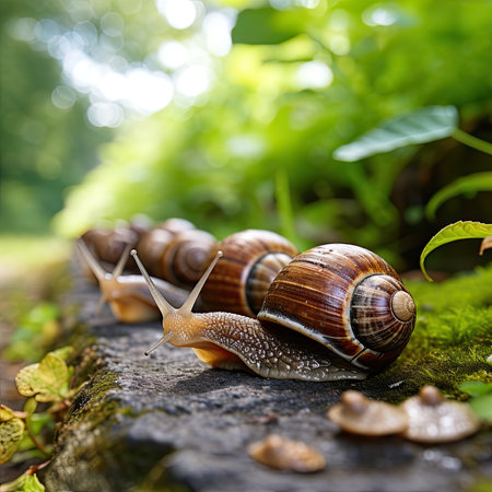 A detailed image of a snail with a patterned shell crawls in a natural setting. The shell exhibits spiral patterns, and the body has a textured surface. The scene is bathed in soft, natural light, and the composition focuses on the subject. Suitable for editorial and commercial use, the image is well-suited for diverse applications.