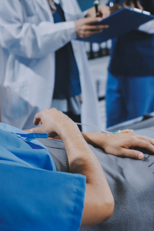 Procedure of endoscopy in the ICU assisted by a team of doctors, unfocused background.