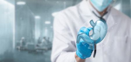 Female doctor holding virtual Stomach in hand. Handrawn human organ, copy space on right side, grey hdr color. Healthcare hospital service concept stock photo