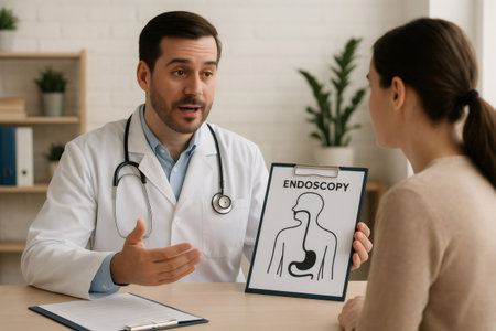 Doctor showing clipboard with endoscopy procedure to patient during consultation in medical office