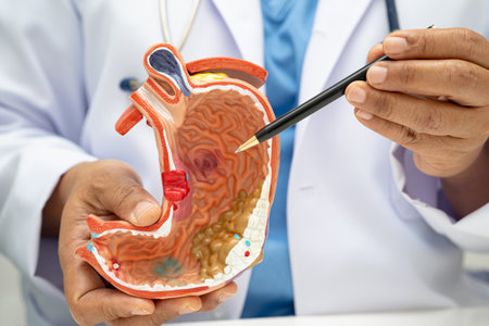 Stomach disease, doctor holding anatomy model for study diagnosis and treatment in hospital.