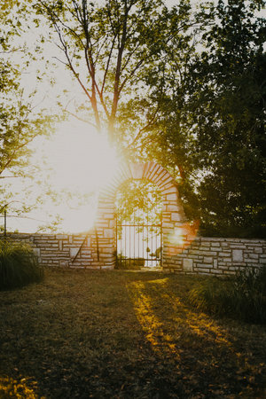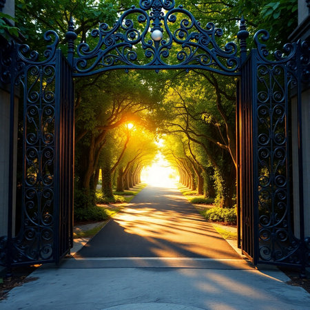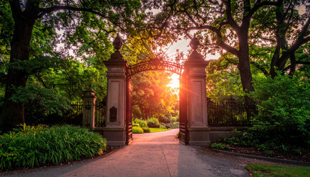 Open wrought iron park gate with a sunburst shining through trees onto a pathway. Clear details and vibrant co...