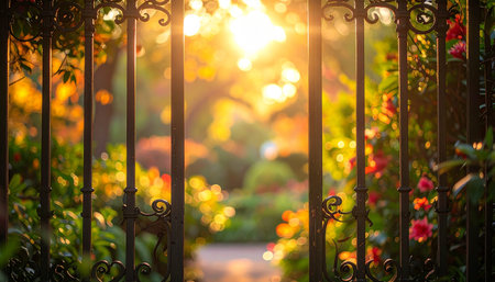 Sunbeams filter through a lush garden gate, casting enchanting shadows and creating a serene atmosphere. Nature beauty is captured in this tranquil scene. Generated A.I.