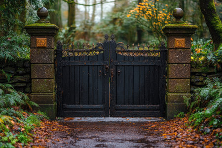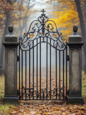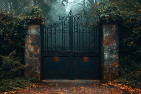 Wrought iron gate protecting a secret garden on a foggy autumn day, creating a mysterious and evocative atmosphere