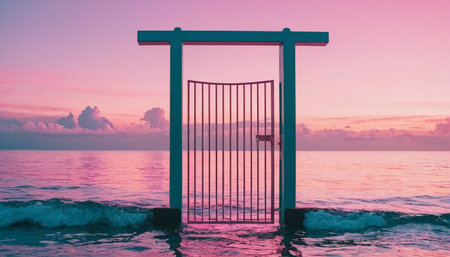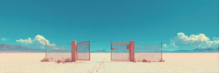 Two open gates in a barren desert contrast with dry earth and distant mountains under a vibrant sky.