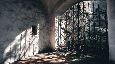 Soft sunlight casting intricate shadows through the bars of an iron door, creating a dramatic contrast of light and dark on the ground. --chaos