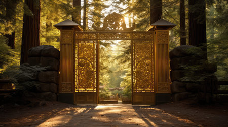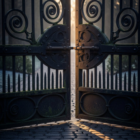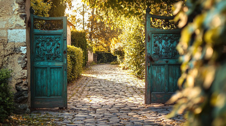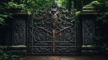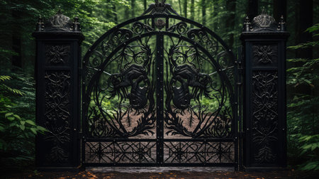 ornate iron gate opening to a hidden path, created with generative ai