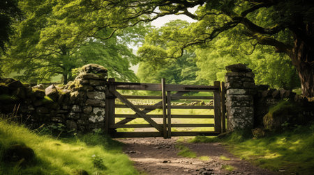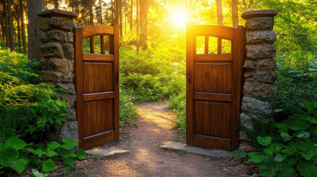 An inviting view through an open garden gate, leading to a sunlit pathway. The scene is filled with lush greenery and the promise of a peaceful journey.